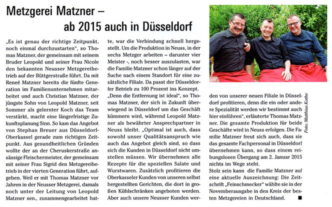 Da mit René Matzner bereits die fünfte Generation im Familienunternehmen mitarbeitet und auch Christian Matzner, der jüngste Sohn von Leopold Matzner, seit Sommer als gelernter Koch das Team verstärkt, macht eine längerfristige Zukunftsplanung Sinn. Da kam das Angebot von Stephan Breuer aus Düsseldorf-Oberkassel gerade zum richtigen Zeitpunkt. Aus gesundheitlichen Gründen wollte der an der Cheruskerstraße ansässige Fleischermeister, der gemeinsam mit seiner Frau Sigrid den Metzgereibetrieb in der vierten Generation führt, aufgeben. Weil er mit Thomas Matzner vor Jahren in der Neusser Metzgerei, damals noch unter der Leitung von Leopold Matzner sen., zusammengearbeitet hatte, war die Verbindung schnell hergestellt. Um die Produktion in Neuss, in der sechs Metzger arbeiten – darunter vier Meister – noch besser auszulasten, war die Familie Matzner schon länger auf der Suche nach einem Standort für eine zusätzliche Filiale. Da passt der Düsseldorfer Betrieb zu 100 Prozent ins Konzept. „Denn die Entfernung ist ideal“, so Thomas Matzner, der sich in Zukunft überwiegend in Düsseldorf um das Geschäft kümmern wird, während Leopold Matzner als bewährter Ansprechpartner in Neuss bleibt. „Optimal ist auch, dass sowohl unser Qualitätsanspruch wie auch das Angebot gleich sind, so dass sich die Kunden in Düsseldorf nicht umstellen müssen. Wir übernehmen alle Rezepte für die speziellen Salate und Wurstwaren. Zusätzlich profitieren die Oberkasseler Kunden von unseren selbst hergestellten Gerichten, die dort in großen Kühlschränken angeboten werden. Aber auch unsere Neusser Kunden werden von unserer neuen Filiale in Düsseldorf profitieren, denn die ein oder andere Spezialität werden wir bestimmt auch hier einführen“, erläuterte Thomas Matzner. Die gesamte Produktion für beide Geschäfte wird in Neuss erfolgen. Die Familie Matzner freut sich auch, dass sie das gesamte Fachpersonal in Düsseldorf übernehmen kann, so dass einem reibungslosen Übergang am 2. Januar 2015 nichts im Wege steht.